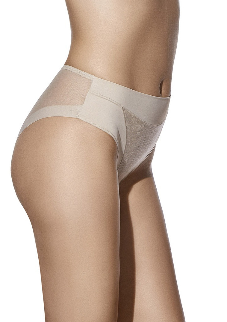 Dámske nohavičky talianskej značky Selene. Nohavičky majú sťahujúci efekt, sú vyššie a nohavičky sú vykrojené. V prednej časti je všitá ozdobná čipka, ktorá je podšitá, takže nohavičky nie sú priehľadné. V páse majú nohavičky širší lem na stiahnutie nohavičiek. Zadná časť je celá z tylu, v strede je šev pre dokonalé prispôsobenie. V strede nohavičiek je všitý bavlnený klin pre pohodlné nosenie. 84 % polyamid, 16 % elastan