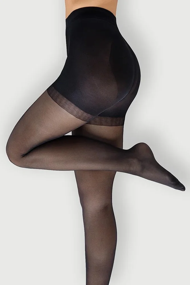 Elastické, sťahovacie pančuchové nohavice 40 deň. Ideálne modelujú líniu bokov a stehien a zároveň splošťují bruško. Štruktúra push-up pozdvihuje a zaguľacuje zadoček. Vďaka rovnomernému stisku dobre priliehajú a sú veľmi pohodlné.