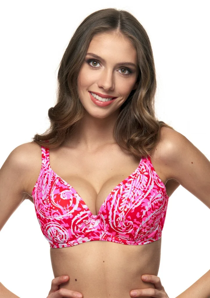 Dámske plavky Fantasy z novej kolekcie Samanta. Vrchný diel plaviek s elegantným farebným vzorom má jemne vystužené košíčky s kosticami a nižší stred. Plavky lemuje úzky prúžok v rovnakej farbe ako podprsenka. Strih košíčkov a stredne široký obvod podprsenky s bočnými elastickými kosticami zaručujú pevné a pohodlné nosenie. Podprsenka má nastaviteľné ramienka, ktoré sa dajú ľahko zapnúť alebo zaviazať za krkom. Zadné zapínanie je ukončené pevne všitou sponou na zaväzovanie. Plavky sú českej výroby a kúpou tohto výrobku podporíte výrobu českého odevného priemyslu. Materiálové zloženie: 80 % polyamid, 20 % elastan.