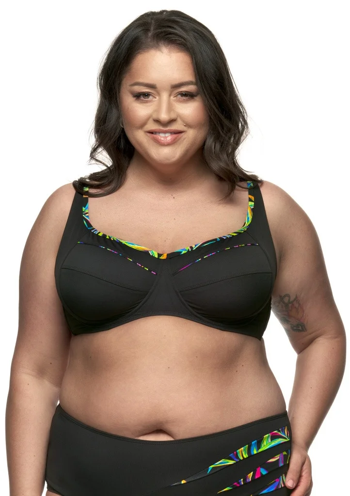 Plavky FANTASY z kolekcie Tropic. Plavková podprsenka nie je vystužená, má kostice a vyšší stred. Má členené košíčky pre dostatočnú oporu aj pre väčšie prsia, ktoré z boku mierne tlačia na prsia. Širšie ramienka sú pevne všité a majú nastaviteľnú dĺžku. Obvod je vyšší, na bokoch vystužený silikónovými kosticami, ktoré sa vám prispôsobia, a je zakončený kovovou sponou na zapínanie. Celý kúsok je podšitý. Podprsenku možno kombinovať s akoukoľvek spodnou bielizňou z rovnakej kolekcie. Zloženie materiálu: 80 % polyamid, 20 % elastan.