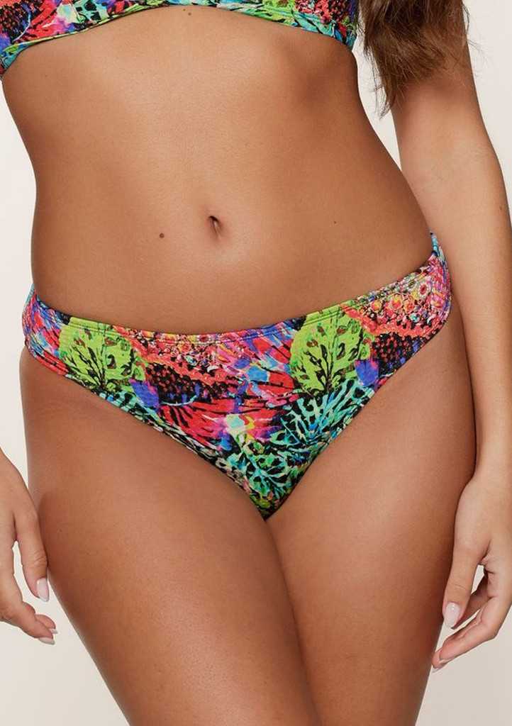 Spodný diel plaviek LingaDore vo veselom tropickom vzore zaujme na prvý pohľad. Klasický strih s pohodlne vyšším pásom krásne sedí, zvýrazňuje siluetu a poskytuje pohodlné krytie. Vďaka kvalitnému recyklovanému materiálu s prímesou elastanu perfektne sedí a drží tvar aj pri celodennom nosení. Materiálové zloženie: 83 % recyklovaný polyamid, 2 % kovové vlákna, 15 % elastan