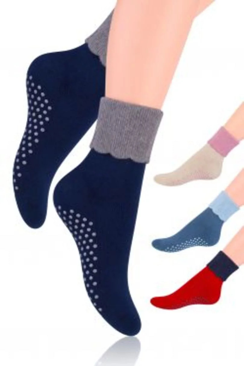 Nekĺzavé dámske froté ponožky s ohrnutým lemom. Model je vyrobený z najkvalitnejšej bavlny. Ponožky sú mäkké a teplé a sú vhodné na chladnejšie dni.