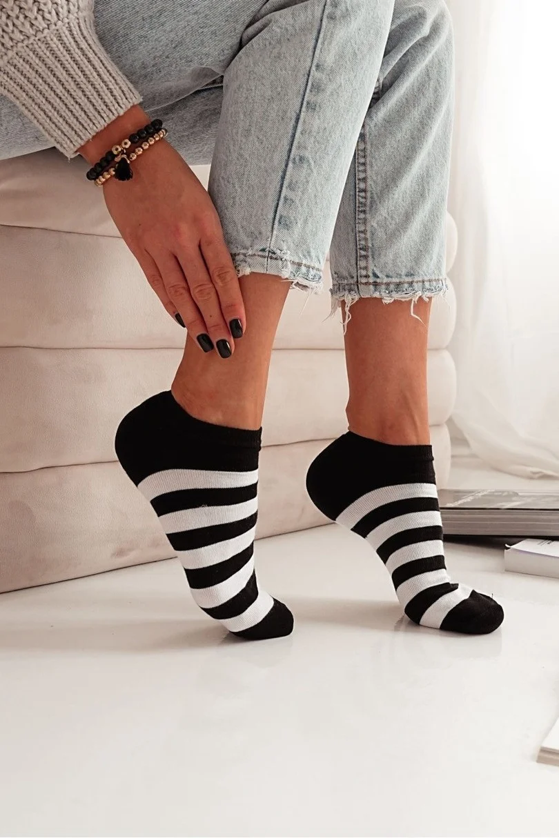 Doplňte svoj každodenný šatník štýlovými dámskymi pruhovanými ponožkami od značky Milena. Sú vyrobené zo vzdušnej bavlny so zmesou elastanu a polyamidu, dokonale priliehajú k nohe a zaručujú pohodlie počas celého dňa. Moderný pruhovaný vzor je ideálny k ležérnym outfitom - k teniskám aj teniskám..
