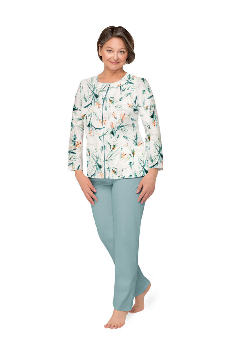 Dámske pyžamo Maria 202 BIG je dokonalou kombináciou pohodlia a elegancie na každú sezónu. Je vyrobené z kvalitnej 100 % bavlny, je mäkké, priedušné a šetrné k pokožke. Vzorované tričko s dlhými rukávmi a okrúhlym výstrihom poskytuje štýlový vzhľad, zatiaľ čo zapínanie na celé gombíky uľahčuje jeho obliekanie. Nohavice s jednou dĺžkou a pohodlným elastickým pásom zaručujú voľnosť pohybu a perfektné prispôsobenie. Je ideálnou voľbou pre ženy, ktoré si cenia pohodlie a klasický štýl! Materiál: 100 % bavlna.