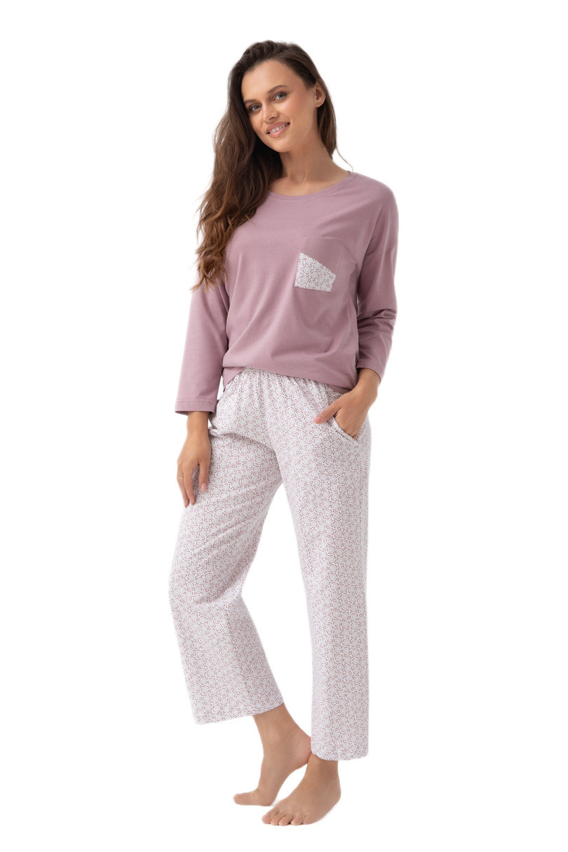 Dámske pyžamo 339 J/25 - štýlový minimalizmus a každodenné pohodlie Dámske pyžamo 339 J/25 je pohodlná súprava určená pre ženy, ktoré oceňujú decentný štýl a prírodné materiály. 7/8 blúzka s rukávmi v kakaovom odtieni bola obohatená o vrecko s rovnakým vzorom ako nohavice, čo vytvára ucelený estetický celok. 7/8 nohavice s vreckami zdobí jemný motív béžových rozetiek na podklade ecru. 100% bavlnené pyžamo je mäkké, priedušné a ideálne na všetky ročné obdobia.