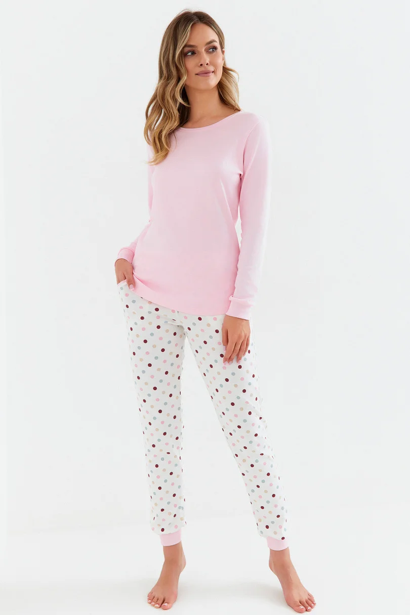 Dámske pyžamo 432 Cana materiál - interlock, 100% bavlna teplý, príjemný interlokový úplet mikina s okrúhlym výstrihom v ružovej farbe nohavice vo farebnom hrášku nohavice s manžetami a pohodlnými vreckami mäkká rebrovaná pletenina s rebrovanými manžetami v ružovej farbe na manžetách mikiny a nohavíc Zloženie: 100 % bavlna