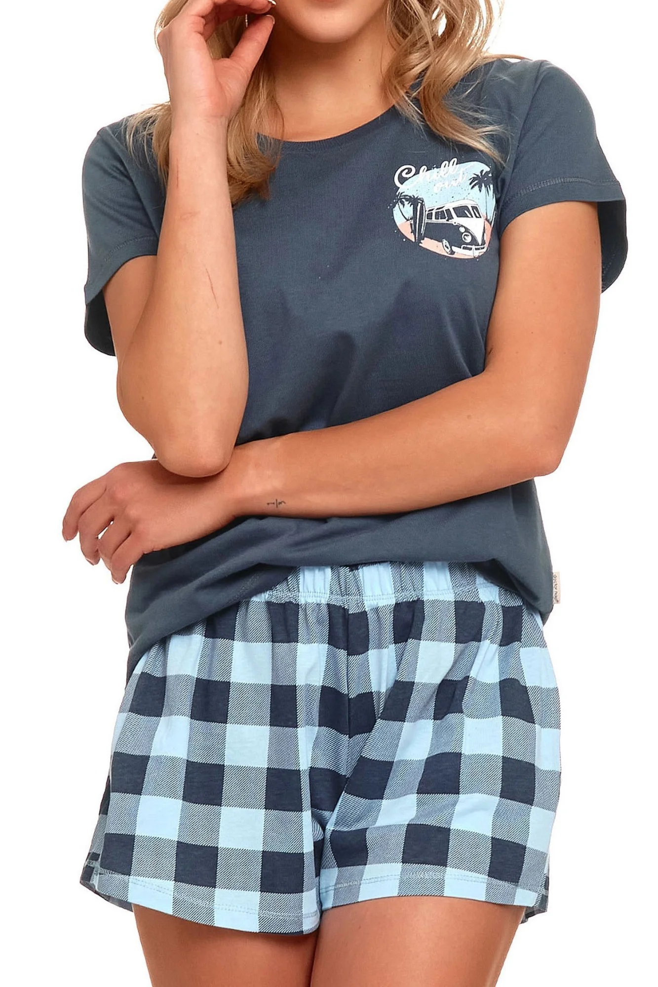 Dámske pyžamo 4417 Doctornap - vyrobené z vysokokvalitnej bavlny - svetlomodré tričko s krátkym rukávom - potlač na prednej strane - kockované šortky s vreckami - certifikát OEKO-TEX Standard 100 Zloženie materiálu: 100% bavlna