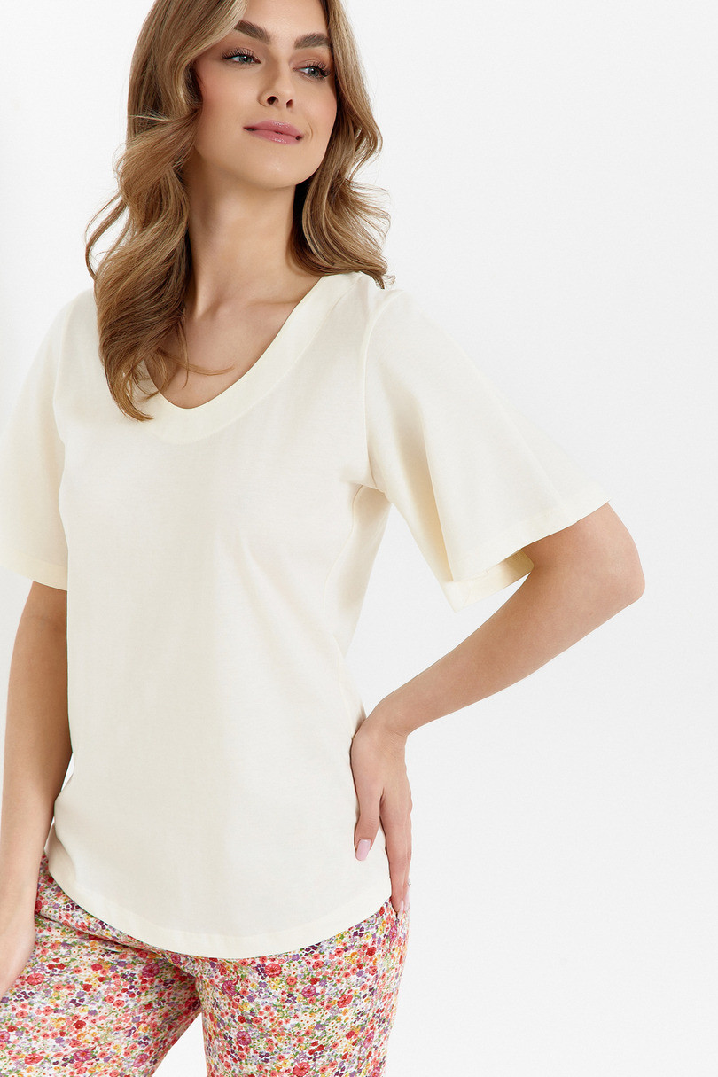 Dámske pyžamo 457 je jedinečnou kombináciou jemného dizajnu a maximálneho pohodlia. Blúzka je vyrobená zo 100 % vzdušnej bavlny, má strih do pása, elegantne rozšírené dlhšie rukávy a klasický okrúhly výstrih so šitými lemami. 7/8 nohavice z kvalitného jednoduchého džerseja zdobí jemný kvetinový vzor technológiou digitálnej tlače, ktorá zaručuje odolnosť a intenzitu farieb. Vďaka praktickým vreckám je pyžamo navyše nielen štýlové, ale aj funkčné. Ideálne na teplé noci a domáci relax. Zloženie: vrchná časť - 100 % bavlna, spodná časť - 100 % bavlna