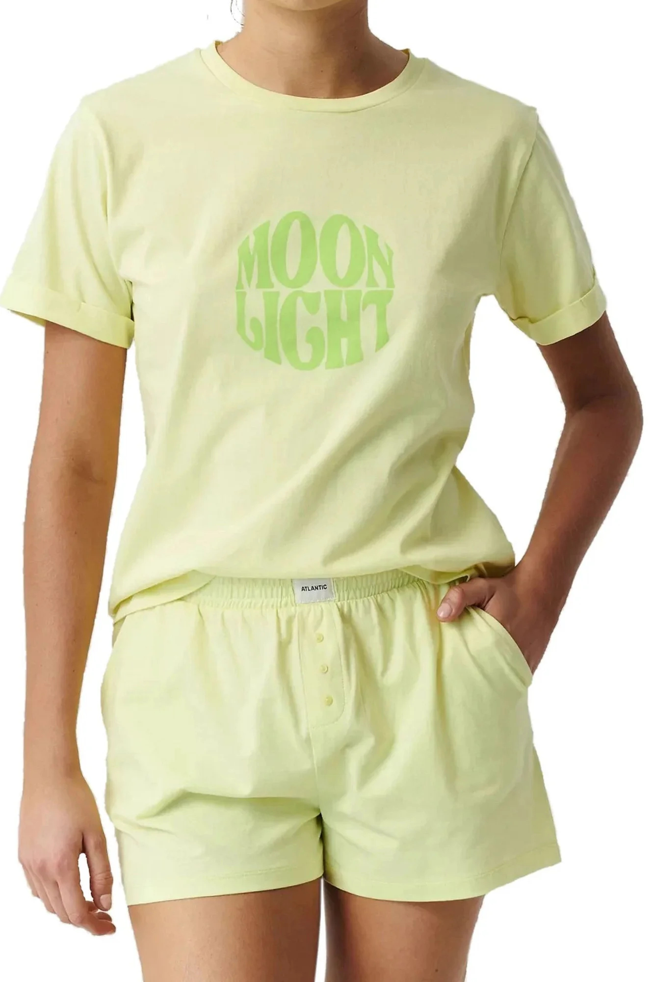 Dámske pyžamo 487 lime Atlantic - vyrobené z kvalitnej bavlny - zelené tričko s krátkym rukávom - zelené šortky s vreckami - elastický pás bez tlaku s logom ATLANTIC - úplná voľnosť pohybu a pohodlie pri noseníZloženie materiálu: 100 % bavlna