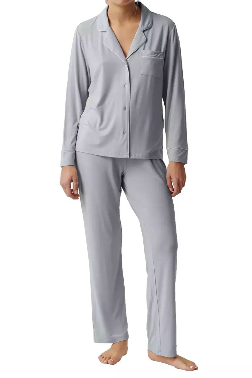 Dámske pyžamo 495 blue Atlantic - vyrobené z kvalitnej bavlny - svetlomodré tričko s dlhými rukávmi - s golierom - zdobené vreckom na prednej strane - zapínanie na gombíky - dlhé modré nohavice - nastaviteľný elastický pásZloženie materiálu: 95% modal + 5% elastan