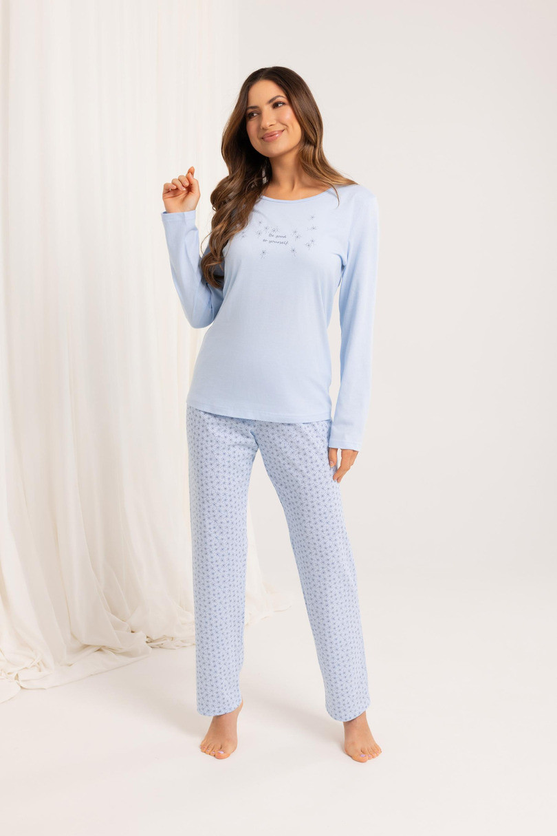 Dámske pyžamo 708 J/25 - pohodlný spánok vo veľkom štýle Dámske pyžamo 708 J/25 je ideálnou voľbou pre ženy, ktoré ocenia pohodlie a jemný štýl. Súprava je vyrobená z kvalitnej 100 % bavlny, ktorá je mäkká, priedušná a príjemná k pokožke. Vrchnú časť súpravy tvorí klasické tričko s dlhými rukávmi, polkruhovým výstrihom a potlačou na prednej strane. Celú súpravu dopĺňajú vzorované dlhé nohavice voľného strihu, ktoré zabezpečujú voľnosť pohybu a pohodlie počas celej noci.