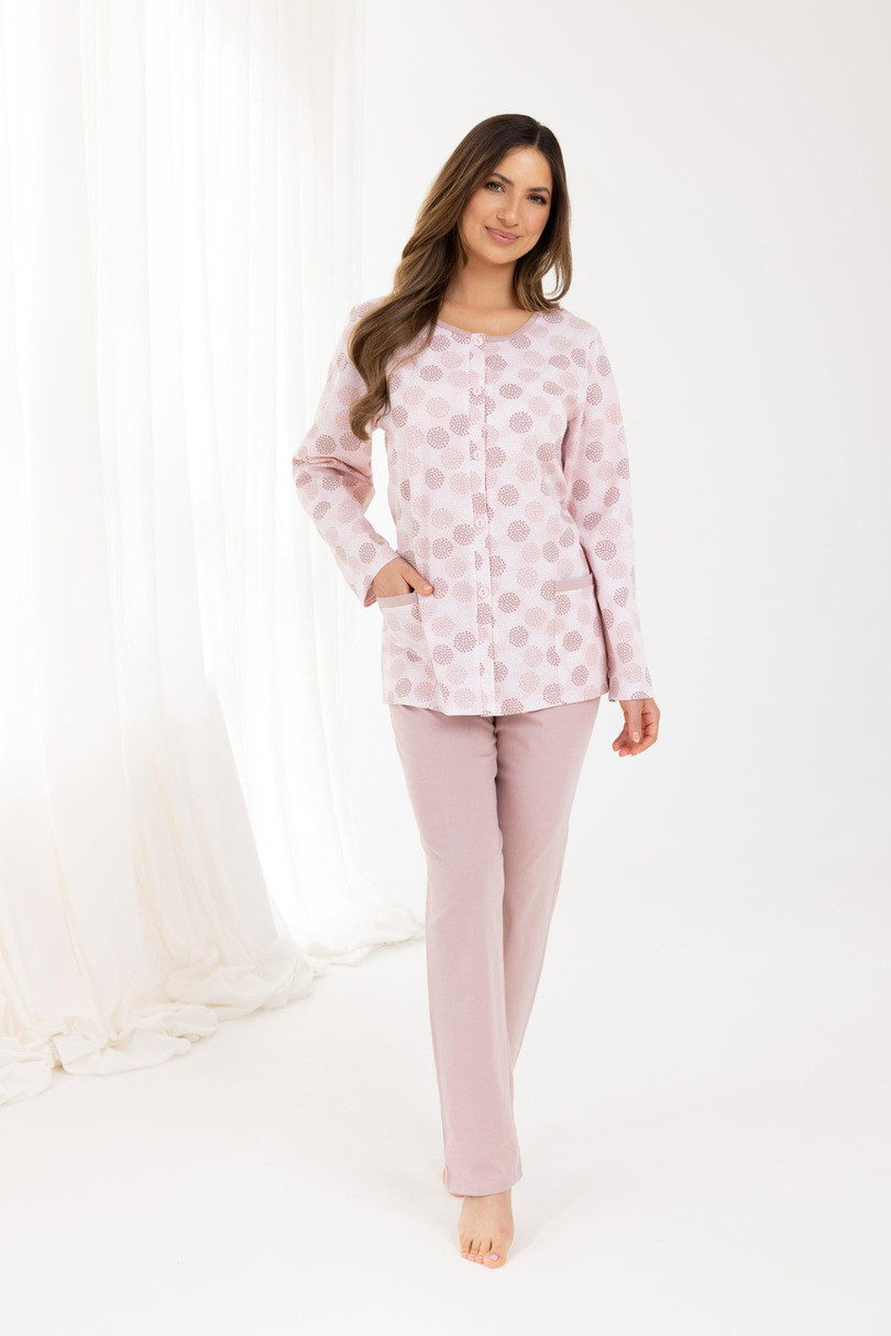 Dámske pyžamo 710 BIG J/25 - klasická elegancia a každodenné pohodlie Dámske pyžamo 710 BIG J/25 je pohodlná súprava vyrobená z kvalitnej 100 % bavlny, ktorá bude ideálna na každé ročné obdobie. Vzorovaná košeľa s dlhým rukávom sa zapína na gombíky, čo zaručuje komfort pri používaní - ideálna aj pre dojčiace mamičky. Model má na spodnej časti blúzky našité dve praktické vrecká. K súprave sú pribalené jednotné dlhé nohavice s elastickým pásom lemovaným bavlnou, ktorý zaručuje pohodlné a mäkké prispôsobenie sa siluete.