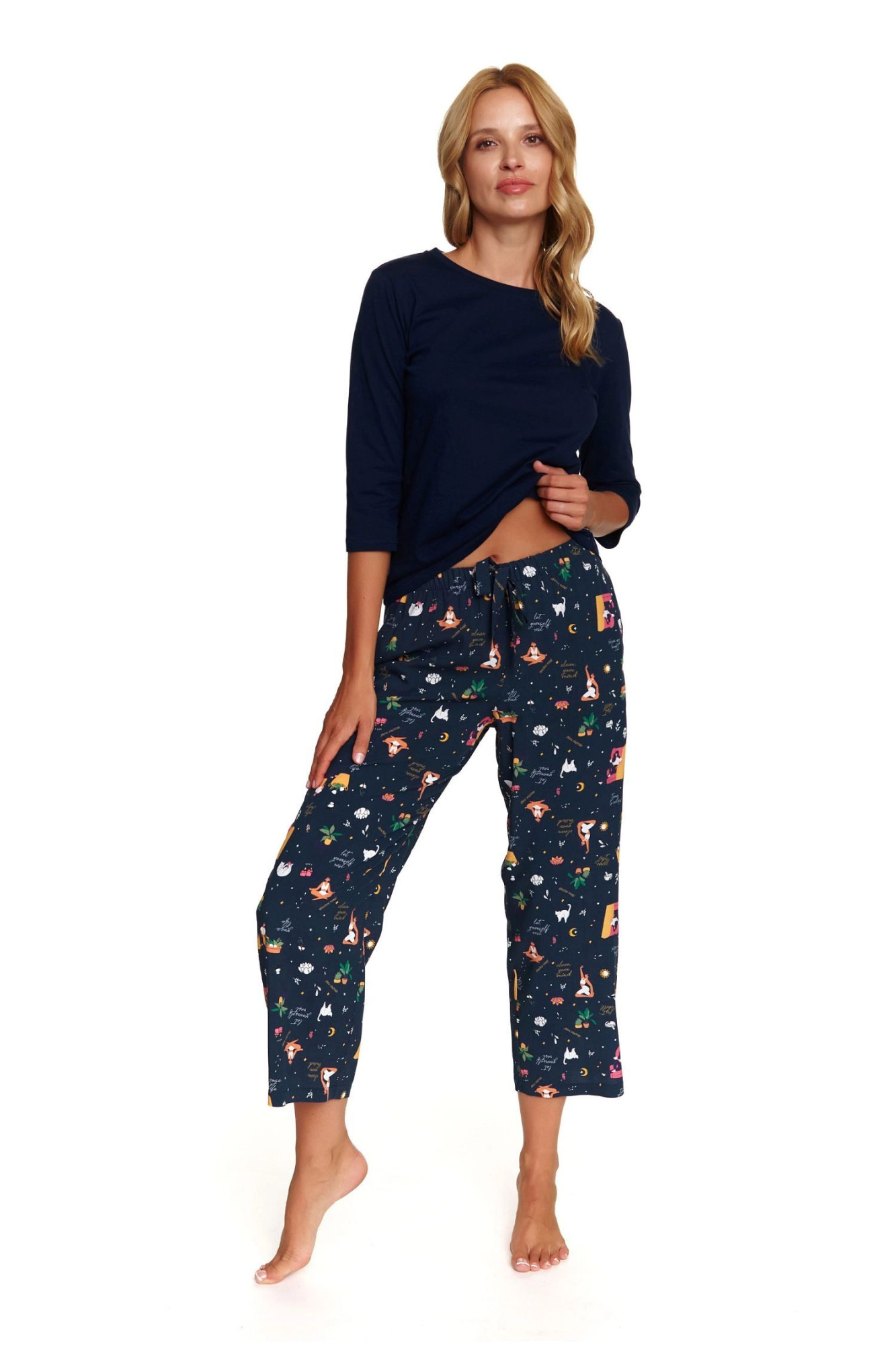 Dámske pyžamo 7162 Yoga Doctornap - tmavomodré - vyrobené z kvalitnej bavlny - tmavomodré tričko s trojštvrťovými rukávmi - vzorované nohavice s vreckami - materiál nohavíc -100% viskóza - certifikát OEKO-TEX Standard 100 Zloženie materiálu: 100% bavlna