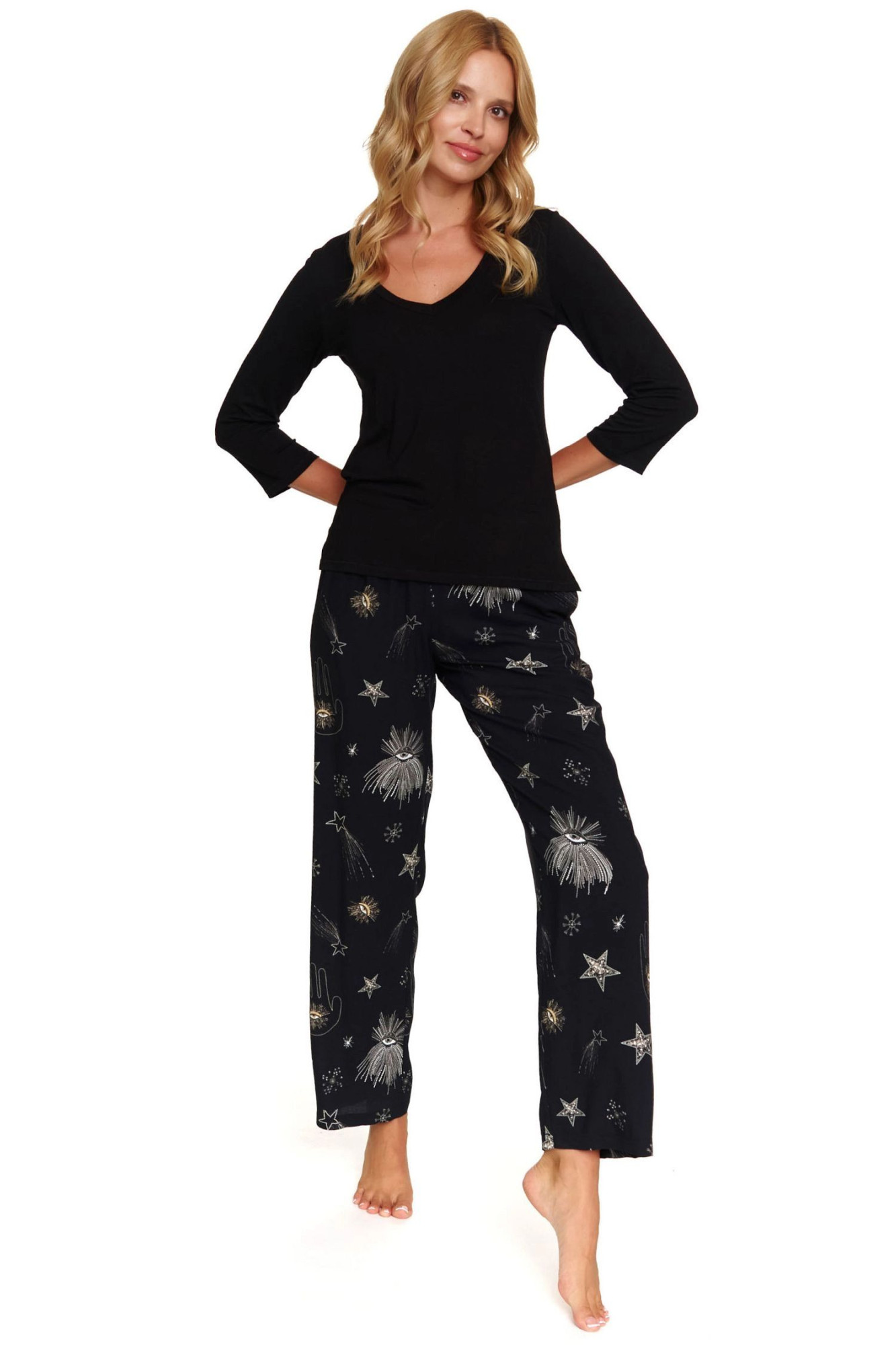 Dámske pyžamo 7178 Doctornap - vyrobené z kvalitnej a príjemnej viskózy - čierne tričko s trojštvrťovými rukávmi - dlhé vzorované nohavice s vreckami - certifikát OEKO-TEX Standard 100 Zloženie materiálu: 95% viskóza + 5% elastan
