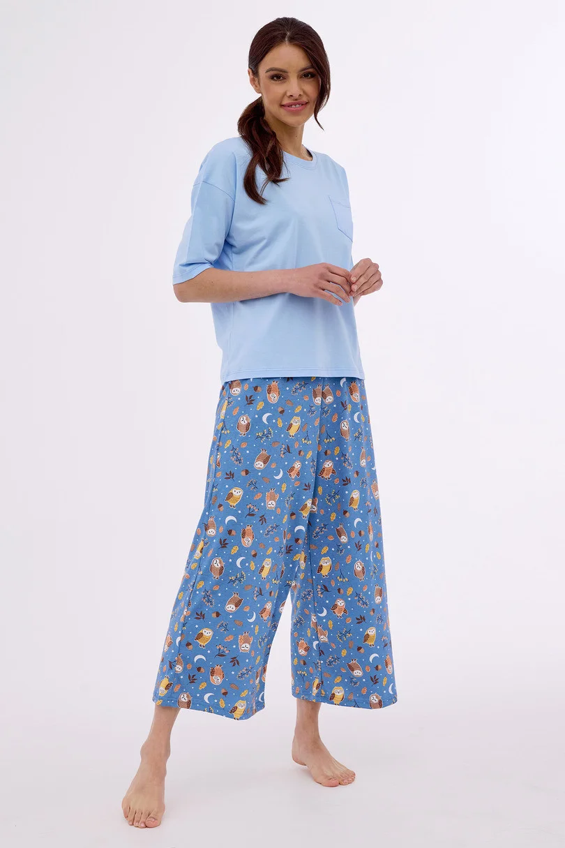 Jednofarebné dámske pyžamo s 3/4 rukávmi, náprsným vreckom a vzorovanými nohavicami.100 % bavlna .