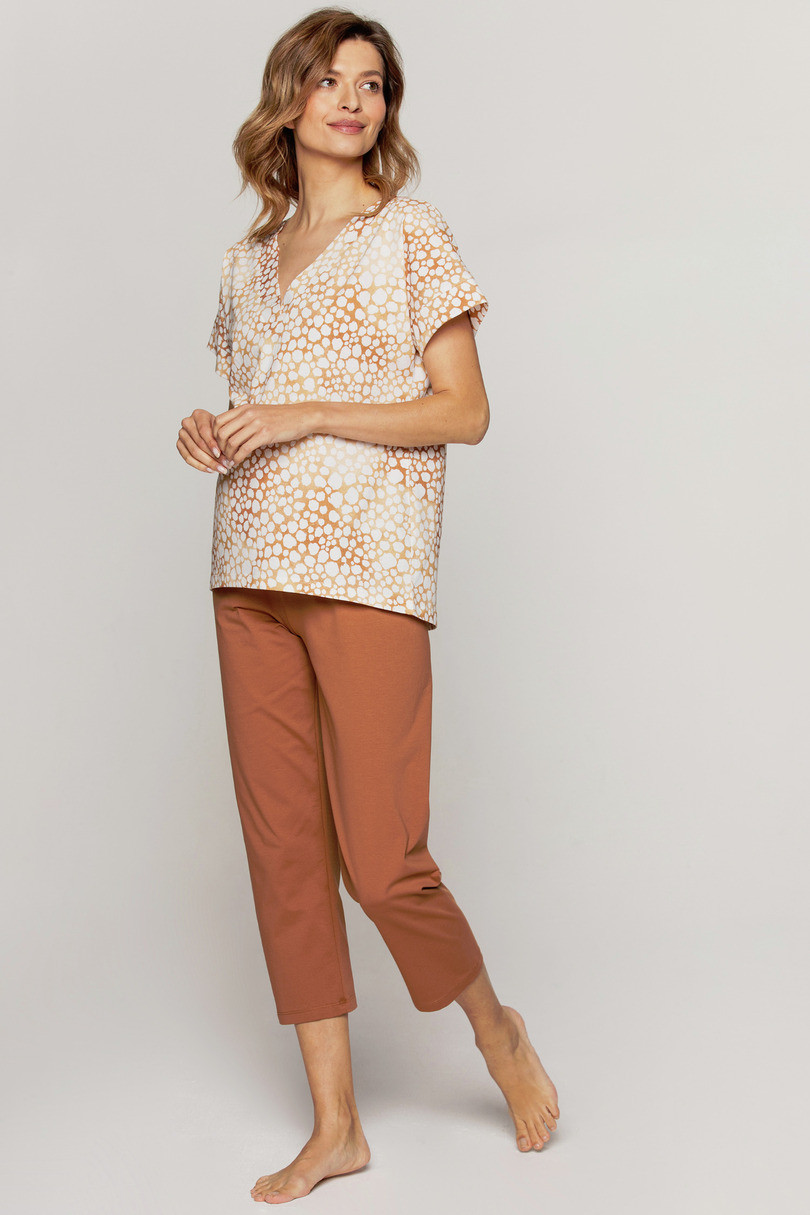 Dámske pyžamo z vysokokvalitného úpletu v modernej ťavej farbe. Krásne ušité s najvyšším dôrazom na detail. Vrchný diel s digitálnou kvalitnou potlačou je voľný a pohodlný, má srdiečkový výstrih a nohavice s 3/4 dĺžkou. Zloženie: vrchný diel: bavlna 95 %, elastan 5 % nohavice: bavlna 100 %