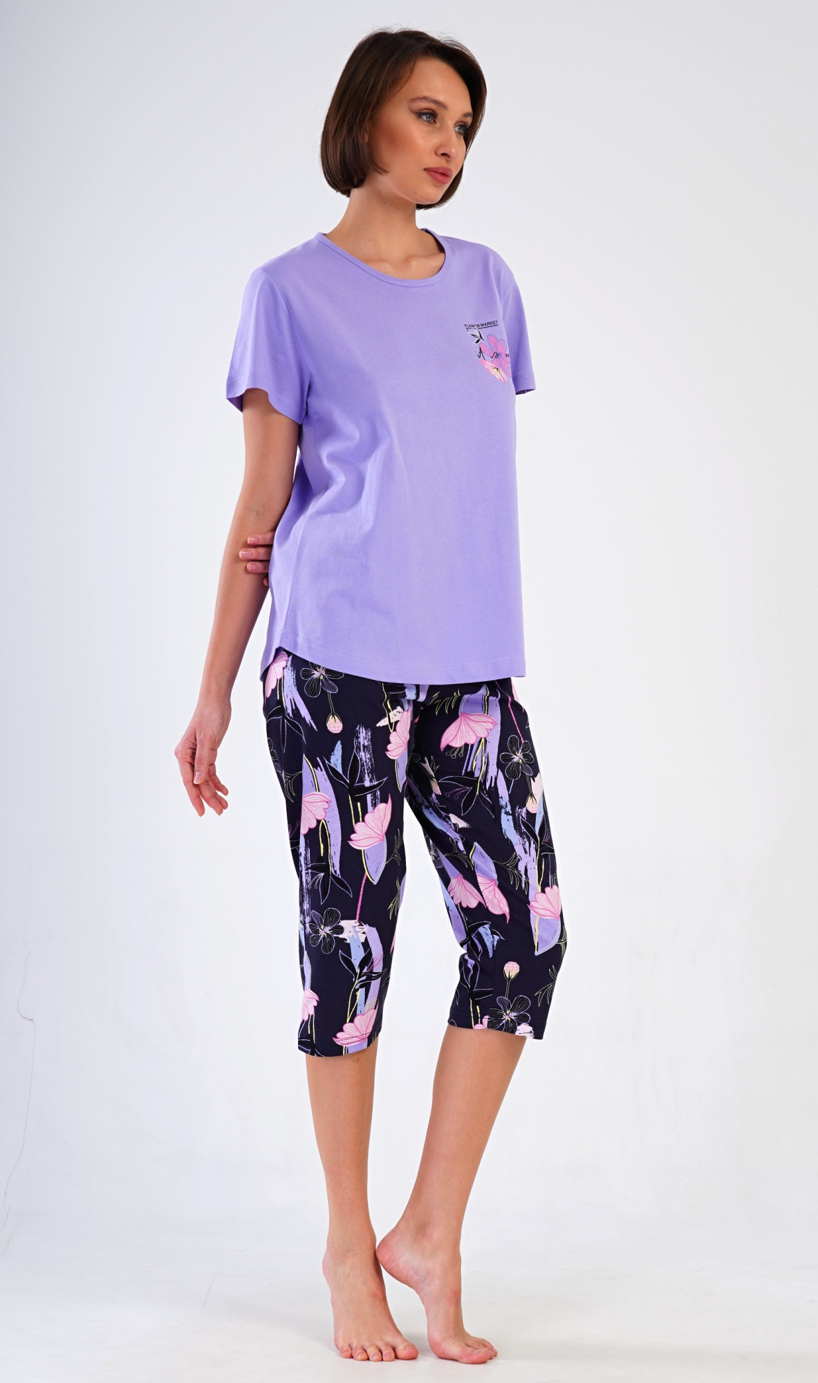Dámské bavlněné kapri pyžamo Flowers. Dámské pyžamo se skládá z trička s krátkým rukávem a tříčtvrtečních kalhot. Tričko s kulatým výstřihem má na hrudi obrázek květu. Tento motiv se opakuje i na kalhotách, které mají v pase gumu a šňůrku na stažení, jsou bez kapes. Použitý bavlněný materiál je příjemný a poddajný na dotek. Pokyny pro údržbu: -100% bavlna - lze prát v pračce při teplotě do 30° - nesušit v sušičce - žehlit z rubu do 110° - nepoužívat bělící prostředky - nečistit chemicky Míry naměřené na výrobku: 4100888010 Flowers 1XL 2XL 3XL 4XL obvod hrudníku 110 114 118 122 délka trika 72 72 72 72 pas 76-88 78-90 80-92 82-94
