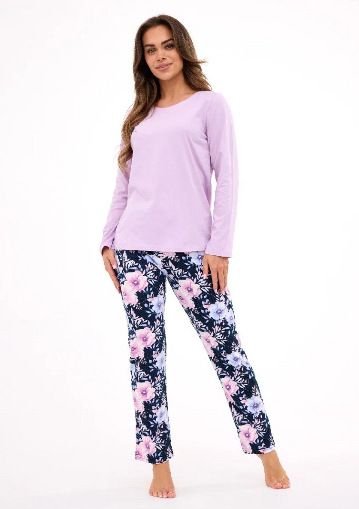 Dámsky dvojdielny pyžamový komplet s hladkým jednofarebným tričkom s dlhými rukávmi a okrúhlym výstrihom. Nohavice sú dlhé s jemným kvetinovým vzorom. Pyžamo je vyrobené z mäkkej a priedušnej bavlny, ktorá je ideálna na pohodlný spánok a na nosenie doma. Nohavice sú v páse elastické pre väčšie pohodlie. Pyžamo je zabalené v škatuli, ktorá môže byť aj pekným darčekom. 100 % bavlna