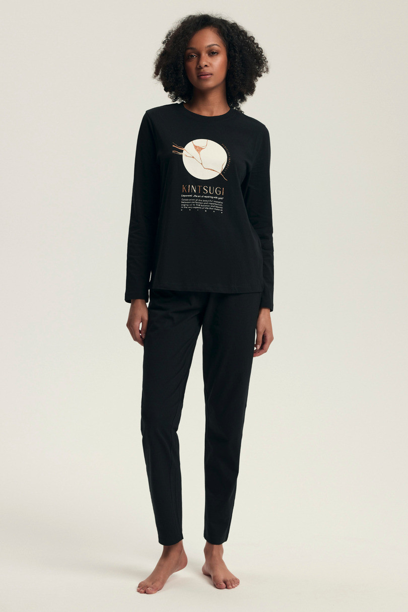Dámske pyžamo DAIROKU 43727 AW25 je pohodlné a štýlové, určené na kvalitný nočný odpočinok a pokojné rána. Je vyrobené zo 100 % kvalitnej bavlny, poskytuje maximálnu priedušnosť, mäkkosť a príjemný pocit na pokožke - ideálne pre tých, ktorí ocenia prírodné materiály.Blúzku s dlhými rukávmi zdobí inšpiratívna potlač v štýle japonskej filozofie Kintsugi, ktorá oslavuje krásu nedokonalostí. Rovné nohavice s elastickým pásom zaručujú pohodlie a dokonalé prispôsobenie bez tlaku.Toto čierne pyžamo spája minimalistický dizajn s hlbokým posolstvom a funkčnosťou - je ideálne na chladnejšie noci aj ako darček pre blízkeho človeka.