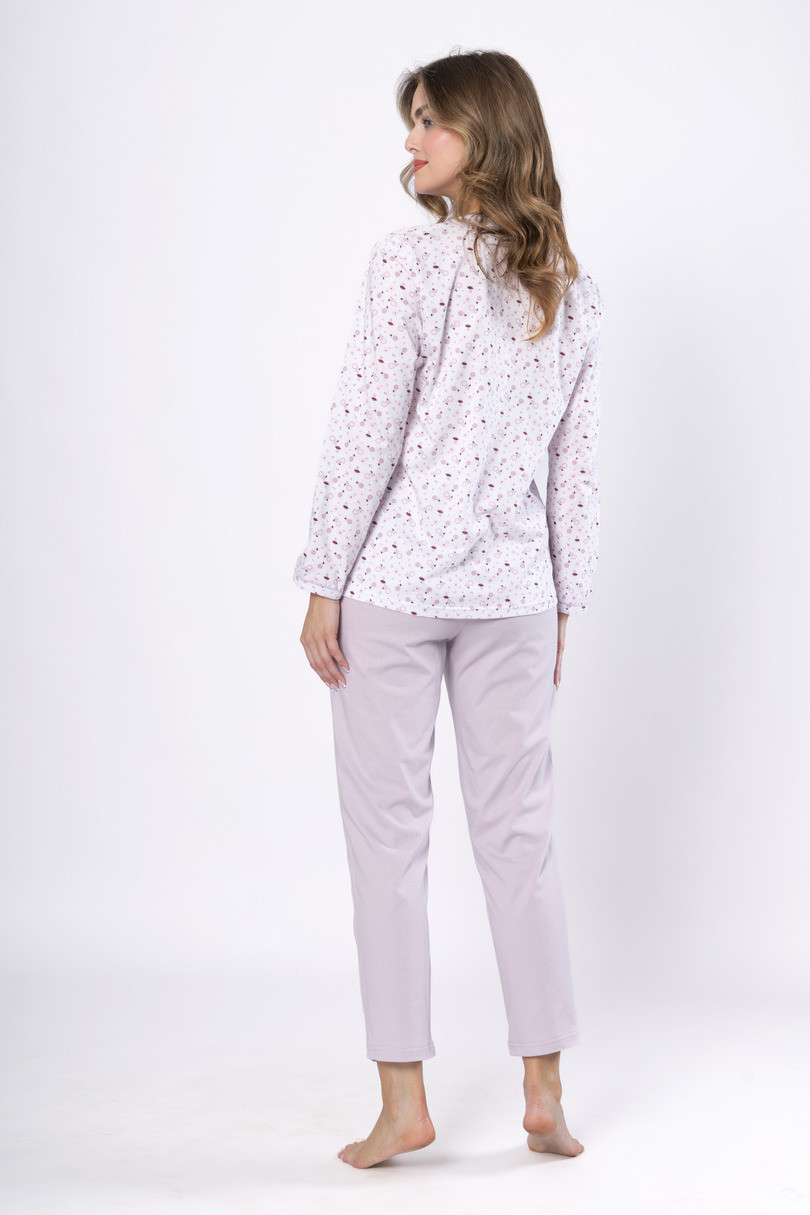 Pyžamo DANUTA 1637 od značky Leveza je štýlovou a praktickou voľbou pre ženy, ktoré ocenia klasiku, pohodlie a jemné detaily. Je vyrobené zo 100 % mäkkej, priedušnej bavlny a zaručuje pohodlie počas celej noci. Neopnutá blúzka s dlhými rukávmi a manžetovými rukávmi má okrúhly výstrih, praktické vrecká a decentné zakončenie v podobe kontrastnej stuhy. Jemný vzor drobných kvetov v kombinácii s bielou a lila farbou dodáva celku ženský šarm. K súprave sa dodávajú lila 7/8 nohavice, ktoré dokonale ladia s vrchným dielom. Pyžamo je dostupné vo veľkostiach od M do 2XL.