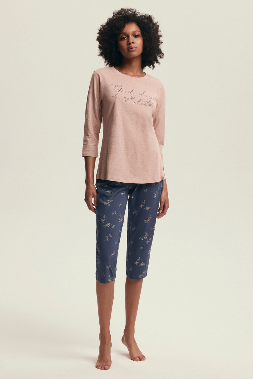 Dámske pyžamo DELANIE 43699 AW25 je ideálne pre ženy, ktoré ocenia jemný štýl, pohodlie a prírodné materiály. Je vyrobené zo 100 % priedušnej bavlny, zaručuje maximálny komfort pri spánku a príjemný pocit na pokožke. Púdrovo ružovú blúzku s 3/4 rukávmi zdobí minimalistická potlač "Good days ahead", ktorá pozitívne naladí na začiatok a koniec dňa. Súpravu dopĺňajú tmavomodré 3/4 nohavice s jemným kvetinovým vzorom, ktoré dodávajú ľahký a ženský nádych. Táto súprava bude fungovať počas celého roka - ako pohodlné pyžamo počas teplejších nocí aj ako súprava na domáci odpočinok. Zloženie: 100 % bavlna