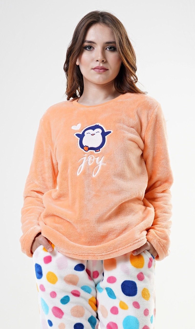 Dámské pyžamo dlouhé softové Kuličky. Dámské pyžamo se skládá z trika s dlouhým rukávem a dlouhých kalhot. Triko je ozdobené aplikací - obrázkem malého tučňáka a nápisem JOY. Softový materiál je hřejivý a hebký na dotek. Kalhoty jsou zdobené pestrobarevnými kuličkami. Kalhoty jsou do gumy, na stažení šňůrkou a mají kapsy, také jsou vyrobeny ze softu. Pokyny pro údržbu: - 100% polyester - lze prát v pračce při teplotě do 30° - nesušit v sušičce - žehlit z rubu do 110° - nepoužívat bělící prostředky - nečistit chemicky Míry naměřené na výrobku: 202109857 Kuličky S M L XL obvod hrudníku 98 102 106 110 délka trika 67 68 69 69 pas 74-86 76-88 84-96 80-92 délka kalhot 103 104 104 105
