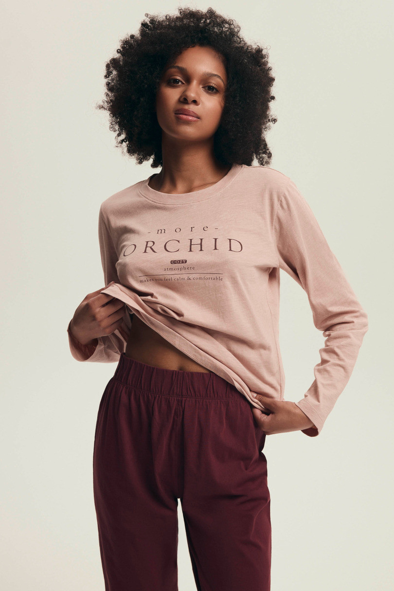 Dámske pyžamo DORLA 43733 AW25 - bavlnené pohodlie na každý deň Objavte výnimočné pohodlie a štýl v dámskom pyžame DORLA 43733 AW25. Tento dvojdielny komplet pozostáva z vrchného dielu s dlhým rukávom v jemnom ružovom odtieni s decentným nápisom a bordových nohavíc s elastickým pásom. Pyžamo je vyrobené zo 100 % mäkkej bavlny, zaručuje celonočné pohodlie a je ideálne aj na lenivé rána alebo pokojné večery. Prírodná tkanina dýcha a stará sa o pokožku bez toho, aby spôsobovala podráždenie, je ideálna pre ženy, ktoré ocenia kombináciu pohodlia a estetiky v domácom štýle. Zloženie: 100 % bavlna