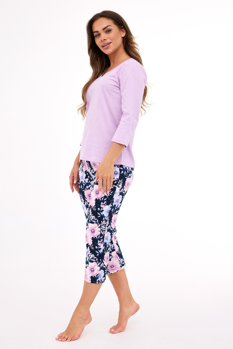 Dámske pyžamo DR 389/463 Natalie 2 značky Cornette je štýlová a pohodlná súprava vyrobená výlučne z prírodnej bavlny. Hladké, pevné tričko so 7/8 rukávmi a výstrihom do V pôsobí elegantne a žensky a zároveň poskytuje plné pohodlie. Súpravu dopĺňajú 7/8 dlhé nohavice zdobené módnym vzorom, ktorý dodáva pyžamu charakter. Elastický pás s bavlnenou podšívkou zaručuje pohodlné nosenie bez akéhokoľvek tlaku. Celá súprava je zabalená v estetickej škatuľke, vďaka čomu sa pyžamo osvedčí aj ako praktický darček.Dámske pyžamo DR 389/463 Natalie 2 značky Cornette je vyrobené výlučne z prírodnej bavlny.