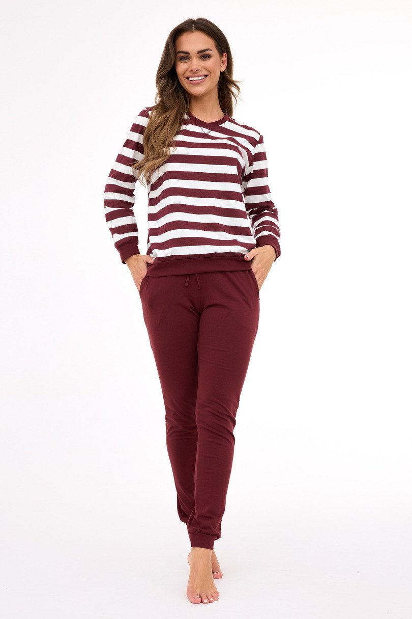 Dámska pyžamová súprava DR 635/468 MOLLY 3 je dokonalou kombináciou pohodlia a módneho dizajnu. Je vyrobená zo 100 % mäkkej, priedušnej bavlny a zaručuje pohodlie a voľnosť pohybu počas celej noci. Blúzka s dlhými rukávmi s elegantnými prúžkami v odtieňoch ecru a hnedej dodáva súprave jemný charakter. Nohavice s dlhými nohavicami majú praktické vrecká a nastaviteľný pás so šnúrkou na stiahnutie pre dokonalé prispôsobenie. Manžety, spodná časť blúzky a nohavice sú zakončené elastickými manžetami, ktoré zabraňujú vyhrňovaniu látky. Pyžamo bude ideálne na večerné spanie a relax doma..