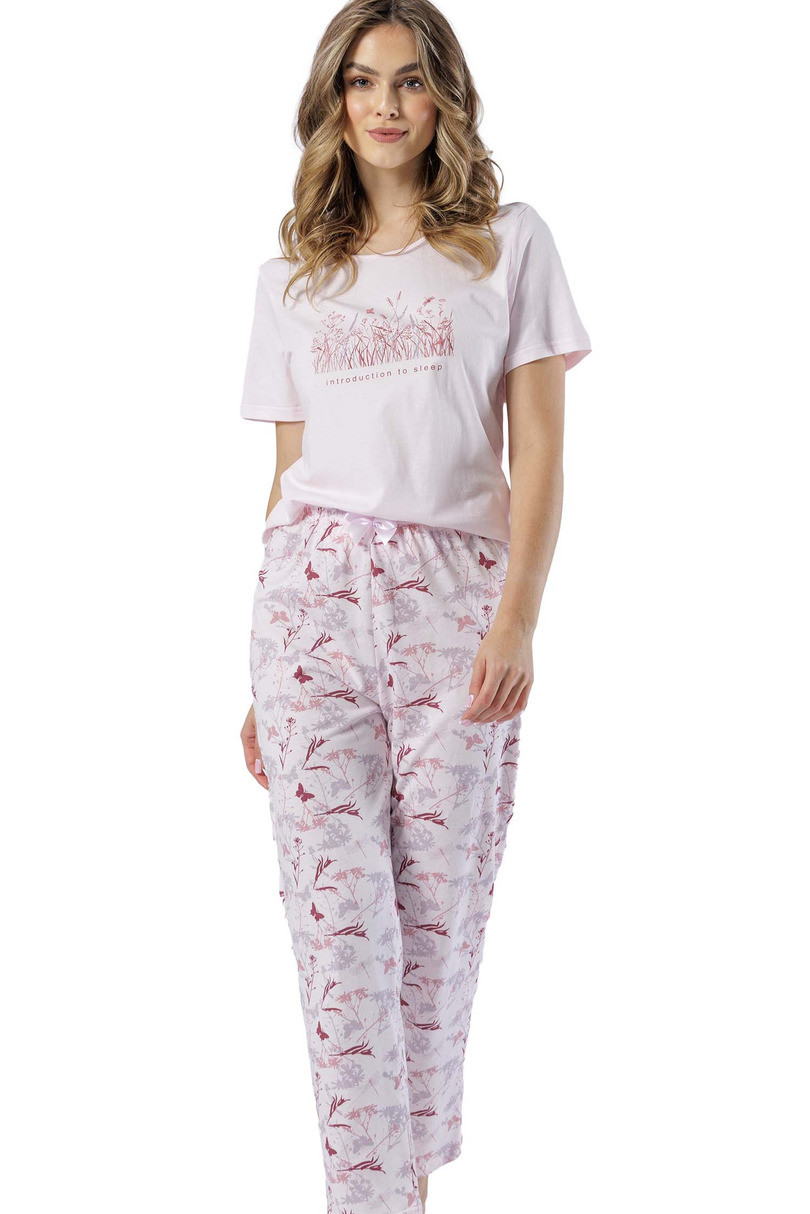 Dámske pyžamo s krátkymi rukávmi z bavlny, okrúhly výstrih, potlač na prednej strane, vzorované 7/8 dlhé nohavice s ozdobnou mašľou v páse.Materiál: 100 % bavlna .