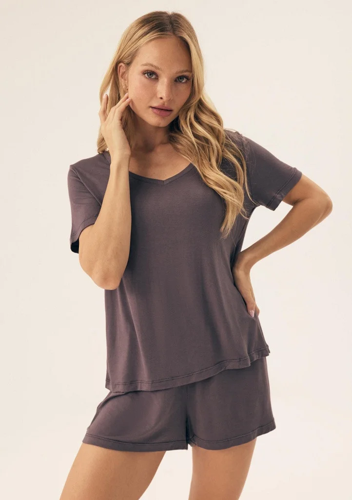 Dámske letné pyžamo značky Henderson vyrobené z veľmi mäkkého a príjemného materiálu, ktorý zaručuje maximálne pohodlie pri nosení. Pyžamo pozostáva z voľného trička s krátkym rukávom a výstrihom do V a šortiek s pohodlným širším elastickým pásom. Vďaka voľnému strihu je ideálne na pokojný spánok alebo na doma. 95 % viskóza, 5 % elastan.