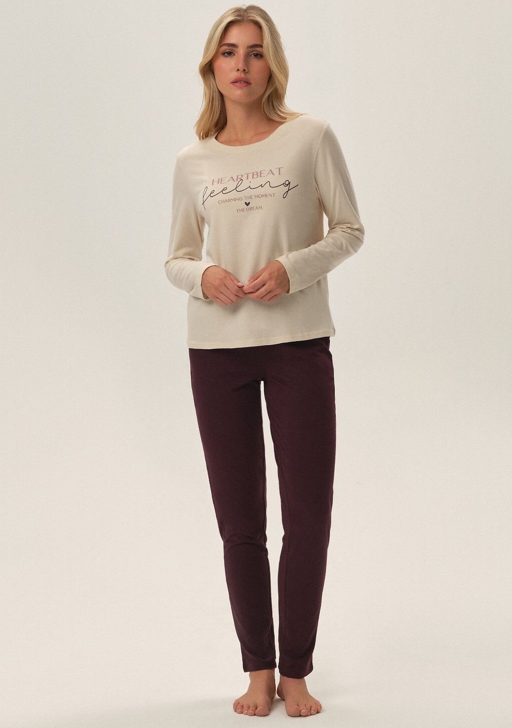 Dámske bavlnené pyžamo od značky Henderson. Vrchný diel pyžama má dlhé rukávy, okrúhly výstrih a potlač vpredu. Nohavice sú dlhé, v páse sú elastické a nemajú úplet. Materiál: 100 % bavlna.