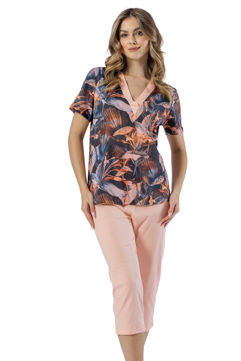 Dámske pyžamo s krátkymi rukávmi z kvetinovej bavlny s výstrihom a kontrastnými lemami, ako aj nohavice s 3/4 dĺžkou. 100 % bavlna .