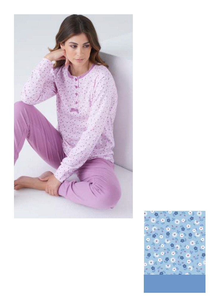 Dámske pyžamo Karelpiu v sebe spája mäkkosť, pohodlie a roztomilý dizajn. Vrchný diel s dlhými rukávmi zdobí drobná kvetinová potlač, ozdobné gombíky a jemná mašlička vo výstrihu. Príjemný bavlnený materiál zaručuje maximálne pohodlie počas spánku a leňošenia. Jednofarebné nohavice s elastickými lemami dopĺňajú outfit. Pyžamo je k dispozícii v dvoch farebných variantoch - jemne ružovej a sviežej modrej. Materiál: 100 % bavlna.