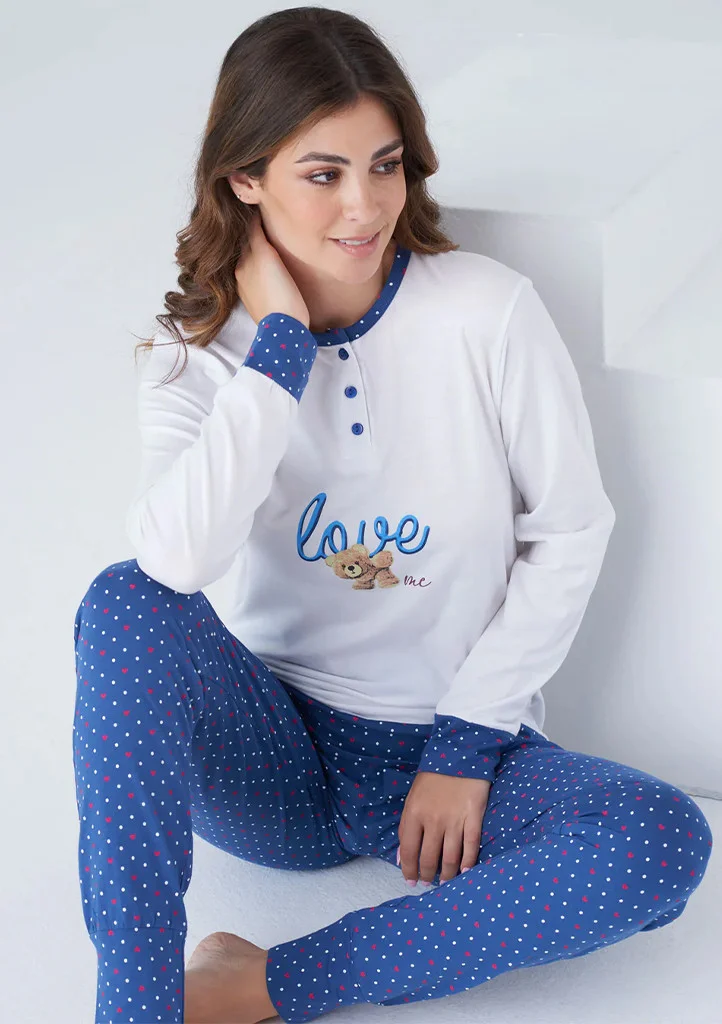 Dámske pyžamo Karelpiu s roztomilou potlačou medvedíka a nápisom "Love me" spája pohodlie a hravý dizajn. Vrchný diel v bielej farbe má kontrastné modré bodkované lemy a zapínanie na gombíky pri výstrihu. Nohavice sú tmavomodré s malým bodkovaným vzorom, majú pohodlný strih a elastický pás. Pyžamo je k dispozícii v dvoch farebných variantoch - tmavomodrom a ružovom. Skvelá voľba pre tých, ktorí chcú spojiť pohodlie s jemným štýlom. 100 % bavlna.