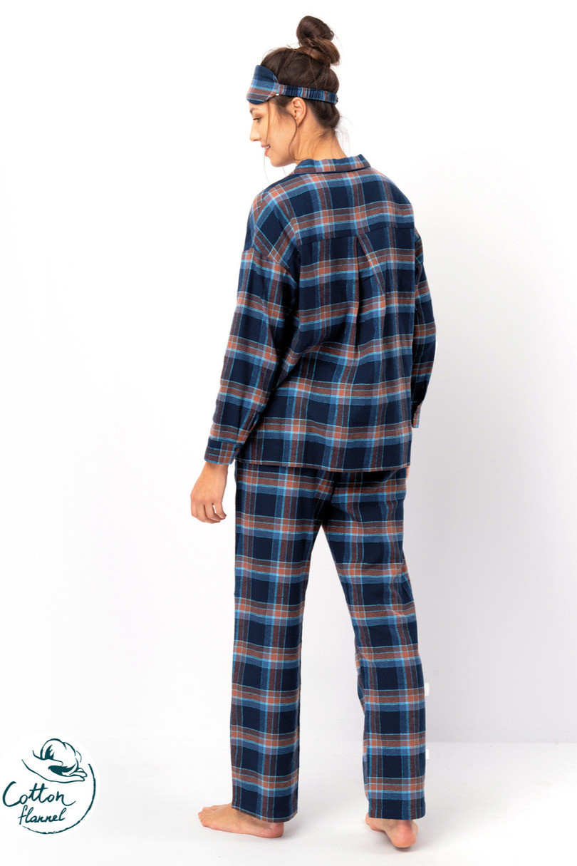 Mäkké bavlnené flanelové pyžamo pre ženy je ideálnou voľbou na zimné večery a rána. Elegantný tmavomodrý a hnedý károvaný vzor mu dodáva klasický, nadčasový charakter. Vrchná časť košele na gombíky má golier a náprsné vrecko, čím sa spája pohodlie s estetikou. Nohavice s rovným strihom a elastickým pásom zaručujú voľnosť pohybu a pohodlie počas spánku. Súčasťou súpravy je aj zodpovedajúca páska na oči, vďaka ktorej si môžete vychutnať pokojný, neprerušovaný spánok. Táto súprava spája praktickosť, teplo a ženský štýl. Zloženie: 100 % bavlnený flanel
