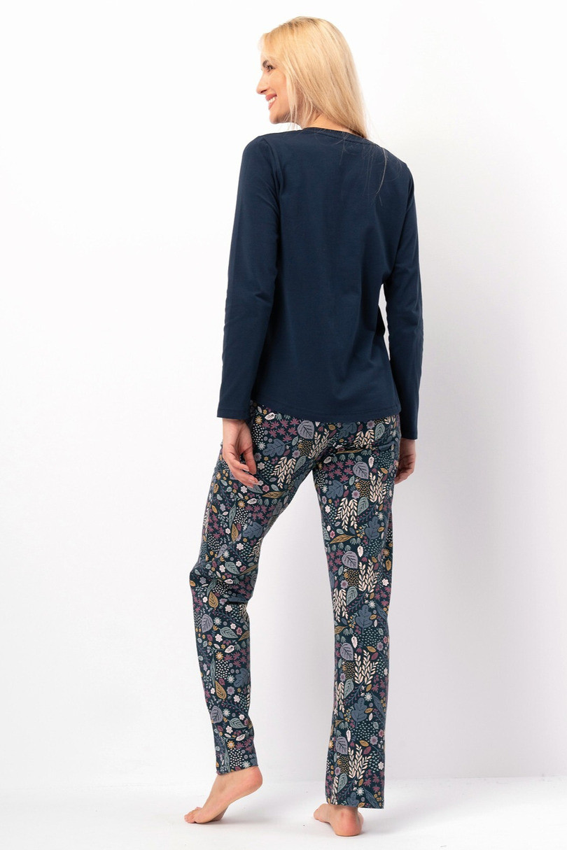 Dámske pyžamo LNS 570 B25 spája pohodlie a módny dizajn, je vyrobené z vysokokvalitného úpletu (95 % bavlna, 5 % elastan), je mäkké, pružné a príjemné na pokožku. Vrchnú časť súpravy tvorí tričko s dlhými rukávmi, polkruhovým výstrihom a výraznou farebnou kvetinovou potlačou na prednej strane. Nohavice s dlhými nohavicami sú rovného strihu, vzorované a majú praktické vrecká na bokoch, pohodlný elastický pás a zaväzovací opasok pre dokonalé prispôsobenie a voľnosť pohybu. Je to ideálna voľba pre ženy, ktoré hľadajú pyžamo, ktoré spája každodennú funkčnosť s módnym štýlom.