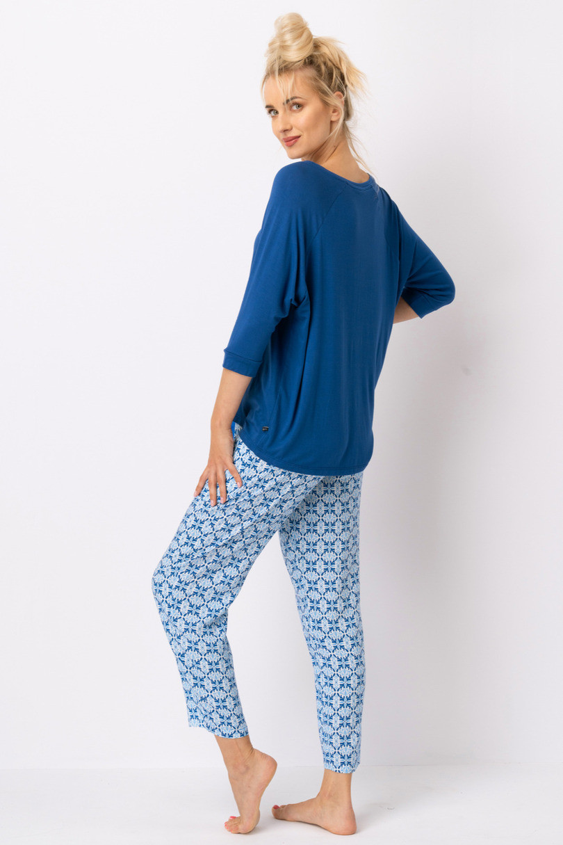 KEY LNS 721 je dámsky pyžamový top, ktorý spája pohodlie s moderným štýlom. Intenzívna tmavomodrá blúzka má voľný oversize strih s 3/4 rukávmi a výstrihom do V. Jemná potlač na rukáve dodáva decentný nádych. Svetlomodré nohavice s kvetinovou potlačou krásne kontrastujú s topom a dodávajú pyžamu ľahkosť. Elastický pás so zaväzovaním zaručuje dokonalé prispôsobenie a celonočné pohodlie. Vyrobené z mäkkej, priedušnej tkaniny - ideálne na relaxačné večery aj pohodlný spánok. Zloženie: 95 % viskóza, 5 % elastan