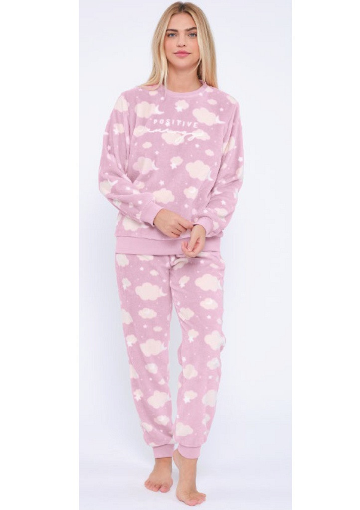 Dámske pyžamo od španielskej značky Muydemi. Pyžamo sa skladá z mikiny a dlhých nohavíc. Mikina má okrúhly výstrih, ktorý je lemovaný elastickým lemom. Na hrudi je vyšitý nápis. Rukávy a spodná časť mikiny sú ukončené elastickým bavlneným lemom. Nohavice majú elastický pás so šnúrkou na prípadné stiahnutie. Nohavice sú ukončené elastickým lemom. Pyžamo je vyrobené z jemného mikroflísu a možno ho nosiť ako domácu súpravu, je príjemné a hrejivé na dotyk. Materiál: 100 % polyester
