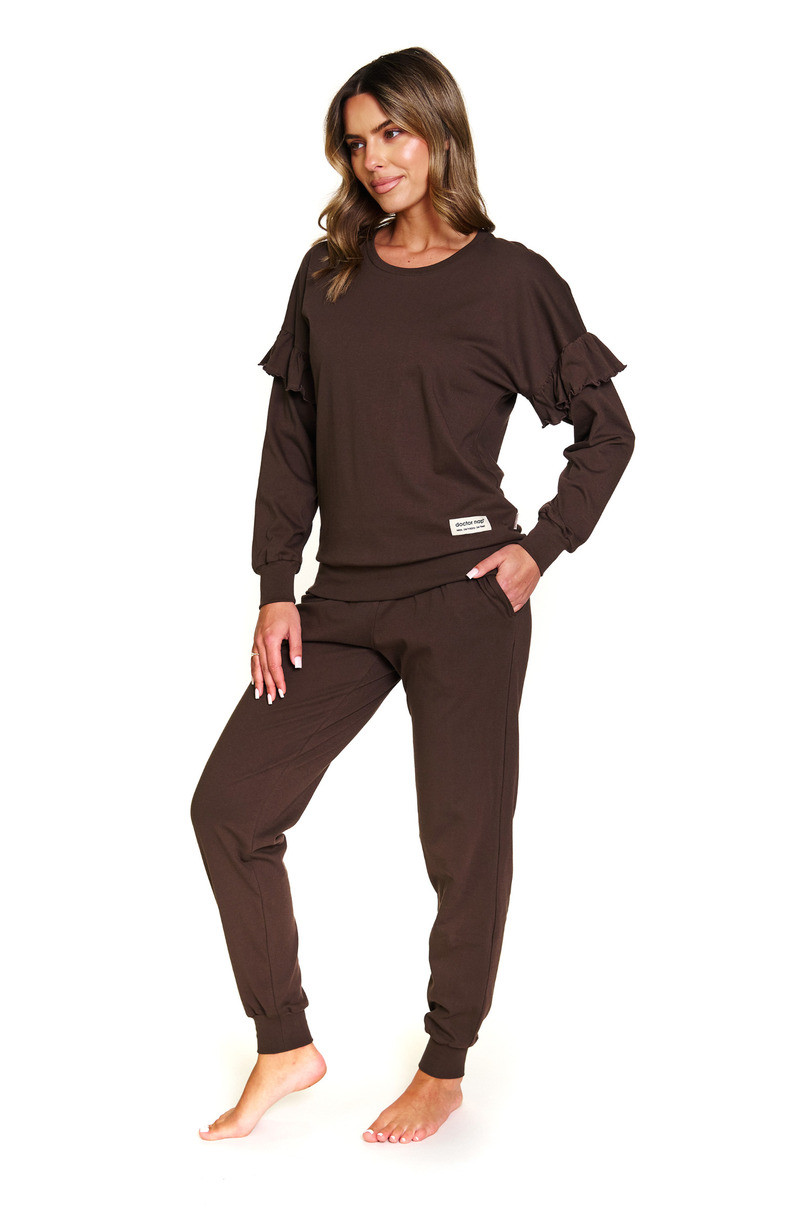 Dámske pyžamo PM.4351 J/25 značky Dr Nap je výnimočne ženský komplet domáceho oblečenia, ktorý spája pohodlie nočnej bielizne s funkčnosťou každodenného nosenia. Je vyrobené zo 100 % mäkkej, priedušnej bavlny a je ideálne na spanie aj na denné nosenie. Vrchnú časť pyžama zdobia volániky na rukávoch, ktoré celku dodávajú ľahký a jemný šarm. Strih zdôrazňuje ženskú siluetu a vrecká v nohaviciach dodávajú praktický charakter.Je ideálnou voľbou pre ženy, ktoré ocenia jemnú eleganciu, prírodné materiály a pohodlný strih
