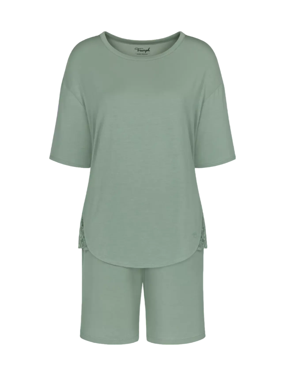 Večery budú teraz o niečo uvoľnenejšie. Materiál jemný na dotyk je šetrný k pokožke a nemusíte ho žehliť. Pretože kto by tým chcel tráviť čas? Pyžamový komplet s krátkymi rukávmi Strih, ktorý lichotí postave Priedušná tkanina príjemná na dotyk Ozdobné čipkované detaily Jednoduchá údržba bez žehlenia OEKO-TEX® STANDARD 100, 93.0.3130 Hohenstein HTTI Materiálové zloženie: 94 % lyocel, 6 % elastan