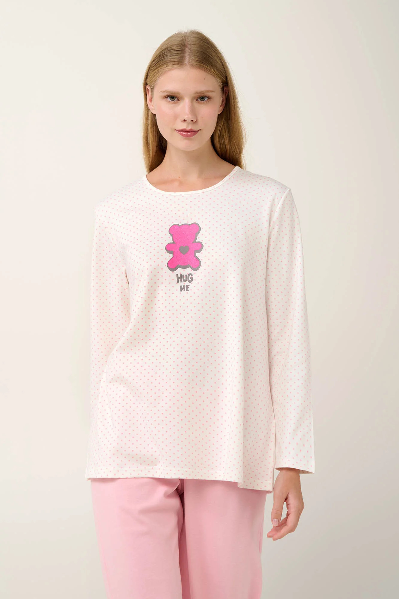 100% bavlna Interlock Dĺžka vrchnej časti: 65 cm. Model: výška 175 cm, veľkosť: Small. Vychutnajte si príjemné zimné večery s týmto dámskym pyžamovým setom zo 100 % bavlny interlock. Set obsahuje hladké nohavice a bodkovaný top s roztomilou potlačou a klasickým okrúhlym výstrihom. Je navrhnutý v regular fit strihu, ktorý ponúka pohodlie a lichotivú siluetu. Tento pyžamový set je ideálny na relaxáciu doma alebo na dobrý spánok a spája v sebe štýl a pohodlie.