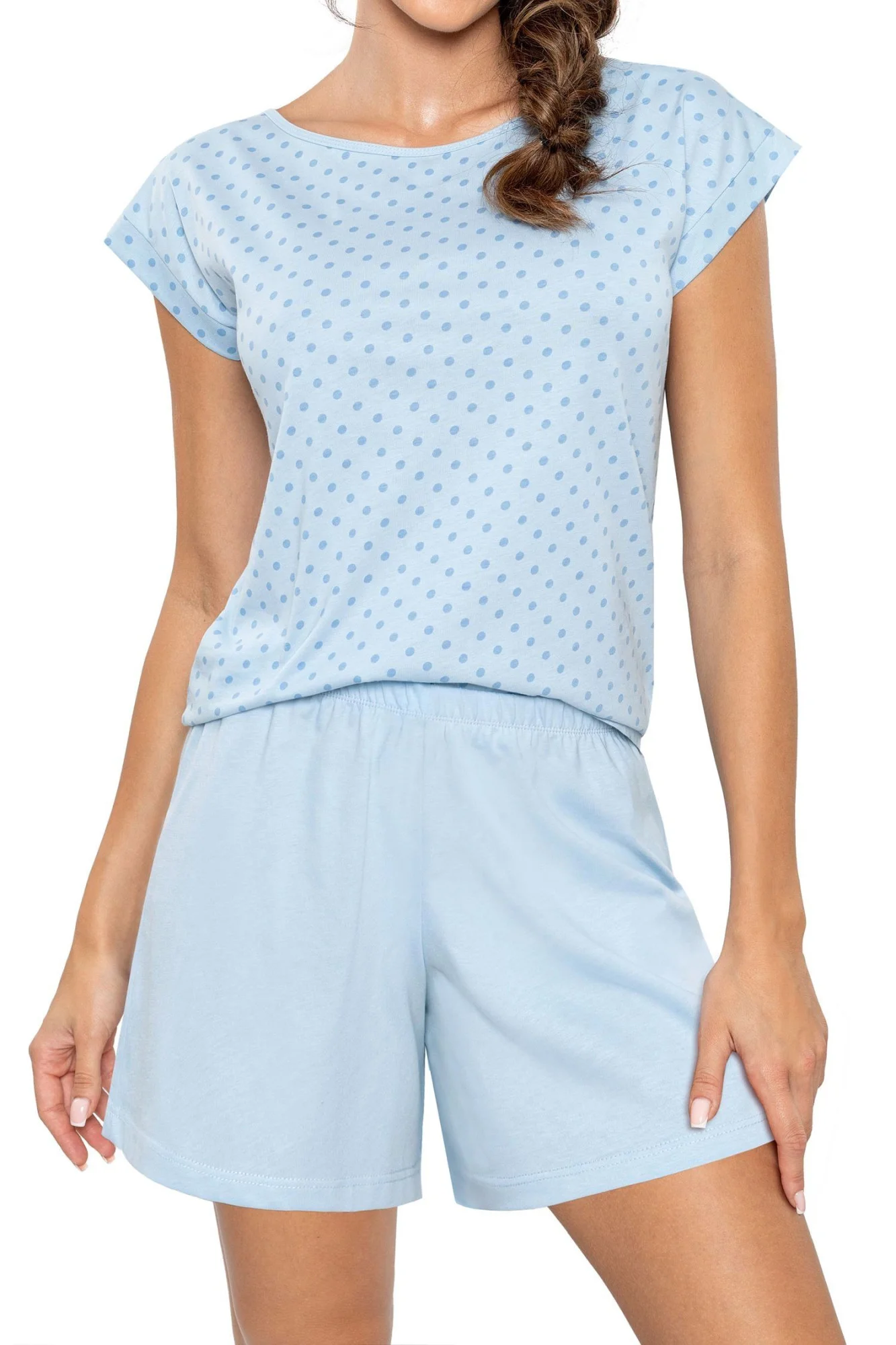 Dámske pyžamo Sky 1/2 Donna - vyrobené z kvalitnej bavlny - svetlomodré tričko s krátkymi rukávmi - s bodkovanou potlačou - polokruhový výstrih - svetlomodré šortky Zloženie materiálu: 100% bavlna