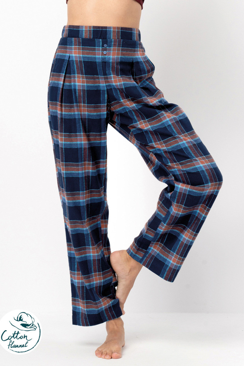Štýlové dámske nohavice z mäkkého, hrejivého bavlneného flanelu, ktorý poskytuje výnimočné pohodlie.Voľný strih zaručuje voľnosť pohybu a elastický pás so zapínaním na gombíky umožňuje dokonalé prispôsobenie.Tmavomodrý károvaný vzor s hnedými akcentmi im dodáva nadčasový charakter.Ideálne na nosenie doma ako súčasť pyžama alebo ako pohodlný domáci vrchný odev na jeseň a zimu.100% bavlnený flanel.