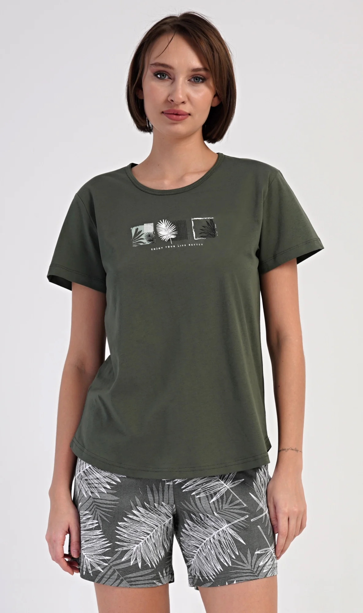 Dámské bavlněné pyžamo šortky Barbora. Dámské pyžamo se skládá z trička s krátkým rukávem a šortkových kalhot. Na jednobarevném tričku jsou obrázky palmových listů. Stejný motiv se opakuje i na šortkách, které mají v pase gumu a šňůrku na stáhnutí, jsou bez kapes. Použitý bavlněný materiál je příjemný a poddajný na dotek. Pokyny pro údržbu: - 100% bavlna - lze prát v pračce při teplotě do 30° - nesušit v sušičce - žehlit z rubu do 110° - nepoužívat bělící prostředky - nečistit chemicky Míry naměřené na výrobku: 4083191526 Barbora S M L XL obvod hrudníku 90 94 98 102 délka trika 62 62 63 64 pas 72-84 76-88 78-90 80-92