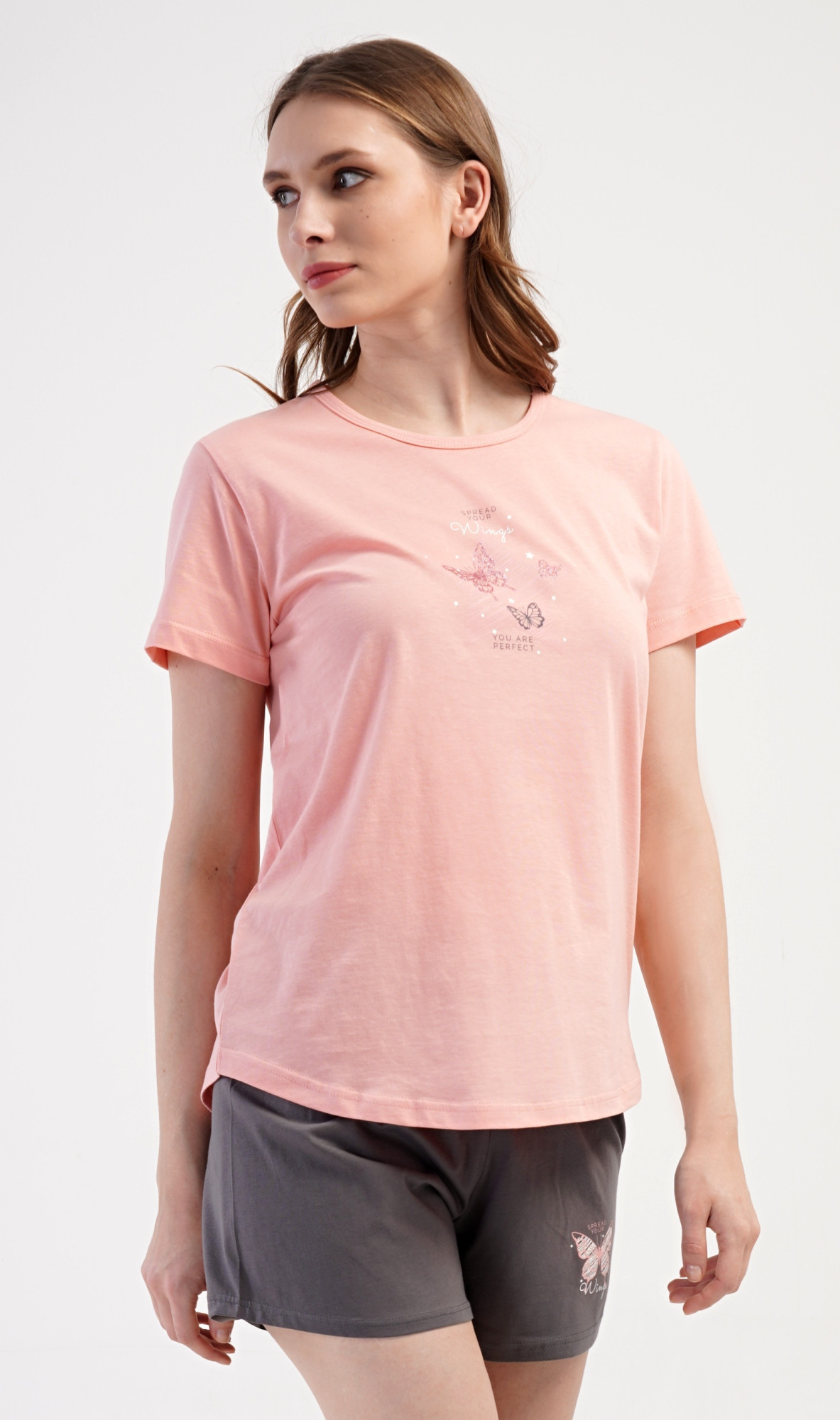 Dámské bavlněné šortkové pyžamo Motýlci. Dámské pyžamo se skládá z trička s krátkým rukávem a šortkových kalhot. Jednobarevné tričko zdobí obrázek motýlků. Stejný motiv se opakuje i na šortkách, které mají v pase gumu a šňůrku na stáhnutí, jsou bez kapes. Použitý bavlněný materiál je příjemný a poddajný na dotek. Pokyny pro údržbu: - 100% bavlna - lze prát v pračce při teplotě do 30° - nesušit v sušičce - žehlit z rubu do 110° - nepoužívat bělící prostředky - nečistit chemicky Míry naměřené na výrobku: 4083930000 Motýlci S M L XL obvod hrudníku 90 94 98 102 délka trika 62 63 64 65 pas 76-88 78-90 80-92 84-96