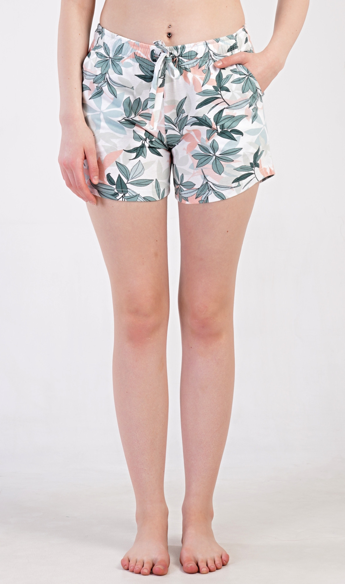 Dámské bavlněné pyžamové šortky Listy. Pyžamové krátké kalhoty jsou zdobeny potiskem listů. Mají v pase gumu, šňůrku na stažení a praktické kapsy. Použitý bavlněný materiál je příjemný a poddajný na dotek. Pokyny pro údržbu: - 100% bavlna - lze prát v pračce při teplotě do 30° - nesušit v sušičce - žehlit z rubu do 110° - nepoužívat bělící prostředky - nečistit chemicky Míry naměřené na výrobku: 5020470000 Listy S M L XL pas 66-78 70-82 80-92 84-96 délka šortek 31 32 33 34
