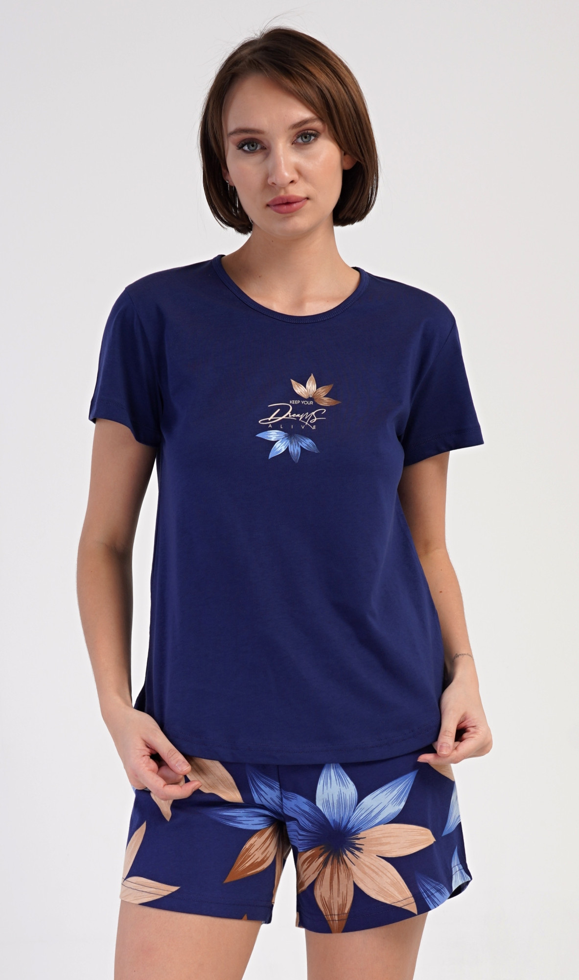Dámské bavlněné šortkové pyžamo Sára. Dámské pyžamo se skládá z trička s krátkým rukávem a šortkových kalhot. Jednobarevné tričko zdobí obrázek květu. Květinový motiv se opakuje i na šortkách, které mají v pase gumu a šňůrku na stáhnutí, jsou bez kapes. Použitý bavlněný materiál je příjemný a poddajný na dotek. Pokyny pro údržbu: - 100% bavlna - lze prát v pračce při teplotě do 30° - nesušit v sušičce - žehlit z rubu do 110° - nepoužívat bělící prostředky - nečistit chemicky Míry naměřené na výrobku: 4090619199 Sára S M L XL obvod hrudníku 90 94 98 102 délka trika 63 64 65 66 pas 70-82 72-84 74-86 76-88