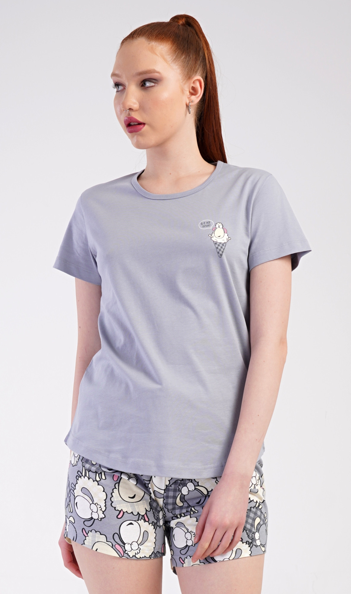 Dámské bavlněné šortkové pyžamo Ovečky. Dámské pyžamo se skládá z trička s krátkým rukávem a šortkových kalhot. Jednobarevné tričko zdobí obrázek veselé ovečky. Tento motiv se opakuje i na šortkách, které mají v pase gumu a šňůrku na stáhnutí, jsou bez kapes. Použitý bavlněný materiál je příjemný a poddajný na dotek. Pokyny pro údržbu: - 100% bavlna - lze prát v pračce při teplotě do 30° - nesušit v sušičce - žehlit z rubu do 110° - nepoužívat bělící prostředky - nečistit chemicky Míry naměřené na výrobku: 4101006224 Ovečky S M L XL obvod hrudníku 92 96 100 104 délka trika 61 62 63 64 pas 70-82 74-86 78-90 82-94