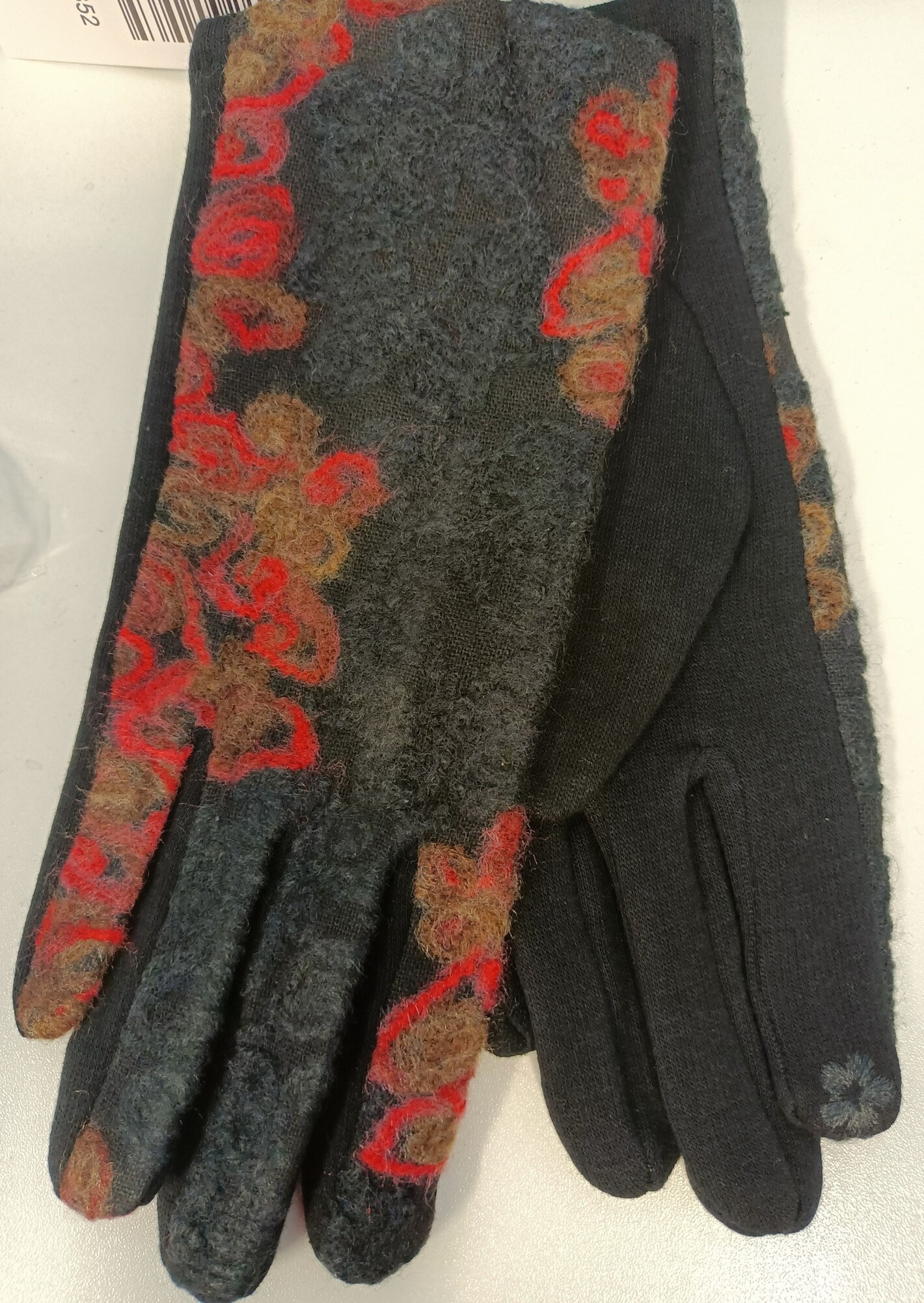 Dámske rukavice, veľkosť 3. Čierne s červenou kvetinovou potlačou. Materiál: 100% polyester
